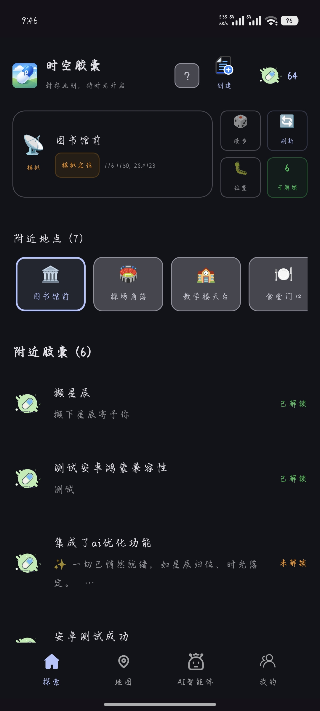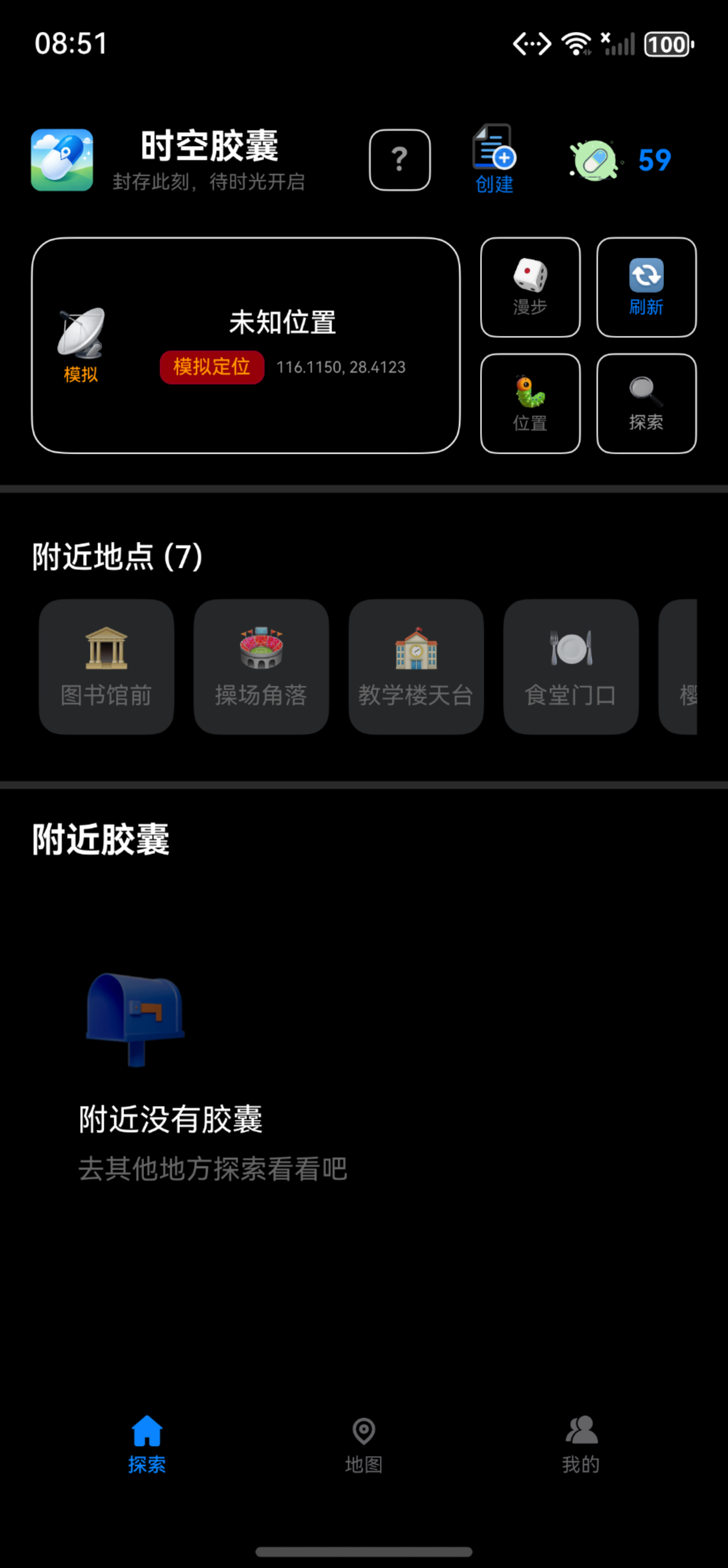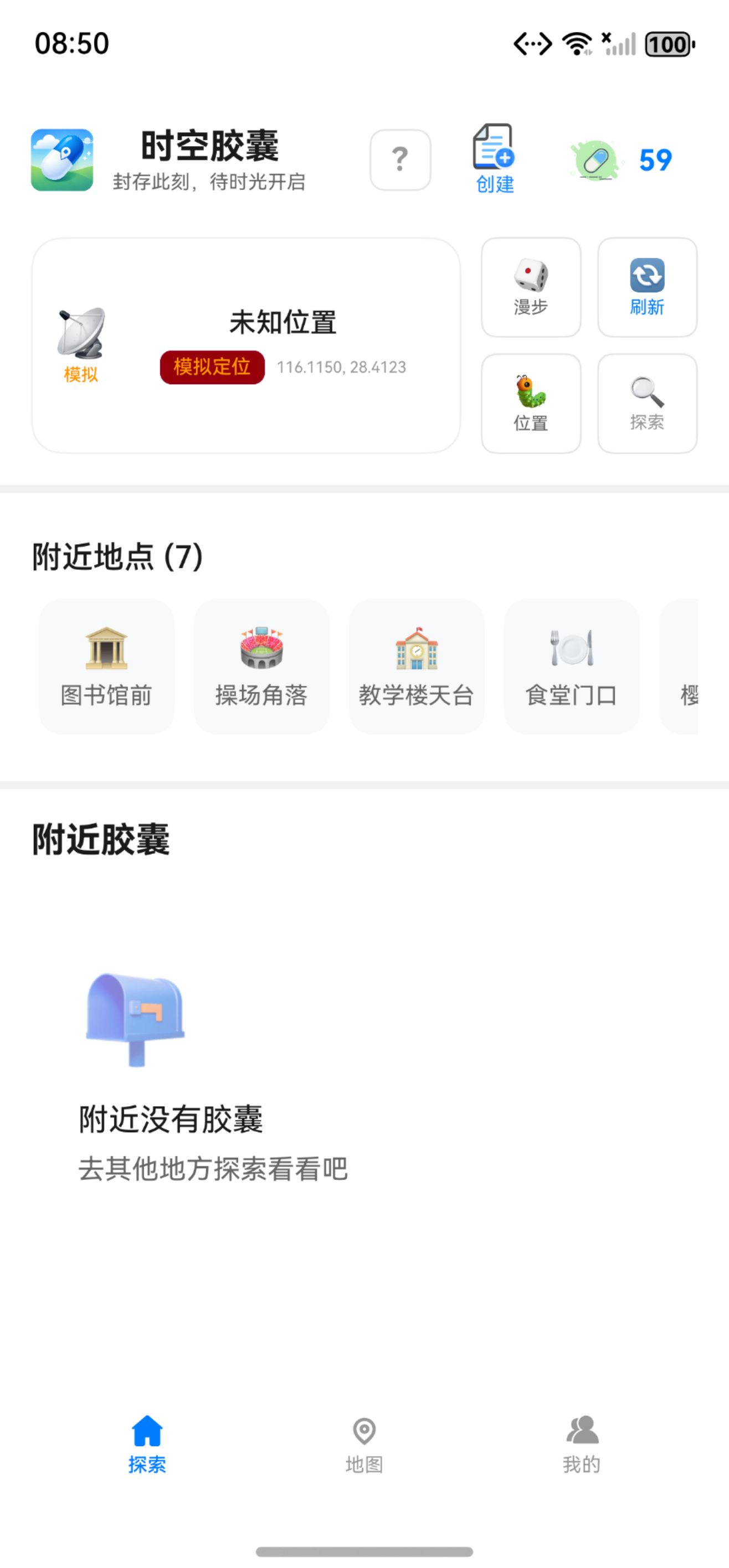 首页顶部实时展示你的当前位置——无论是真实的GPS定位,还是校园模拟场景。绿色代表真实世界,橙色意味着你在模拟漫步,无论哪种方式,都不妨碍你发现身边的胶囊。