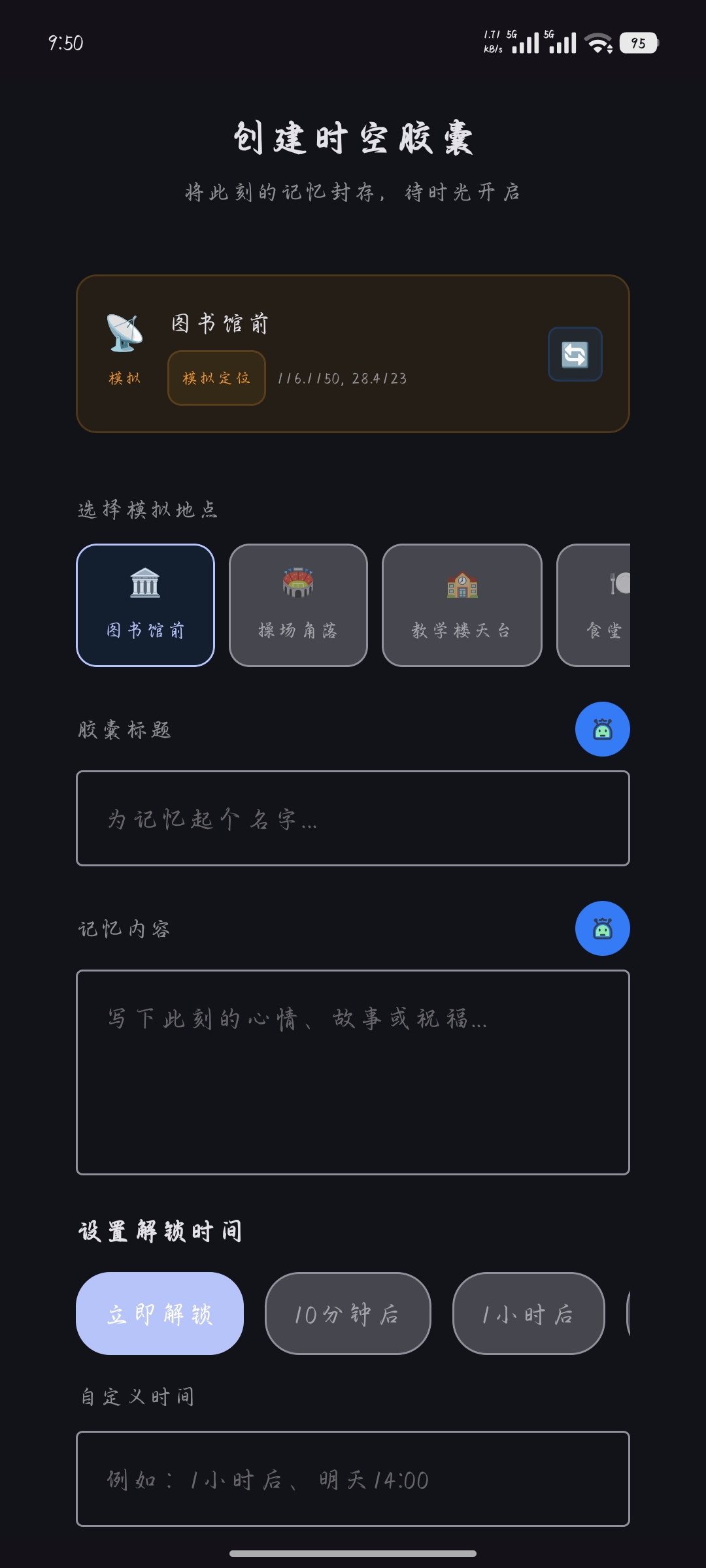 “时空胶囊”是一款基于地理位置的个人记忆管理工具。它允许用户在特定的真实地点(如校园、公园)创建并封存数字记忆胶囊(如文字),只有当用户再次亲临该地点时才能解锁并回顾内容。该应用通过云端同步技术,为用户提供了一个私密的、与地点深度绑定的数字记忆珍藏空间。